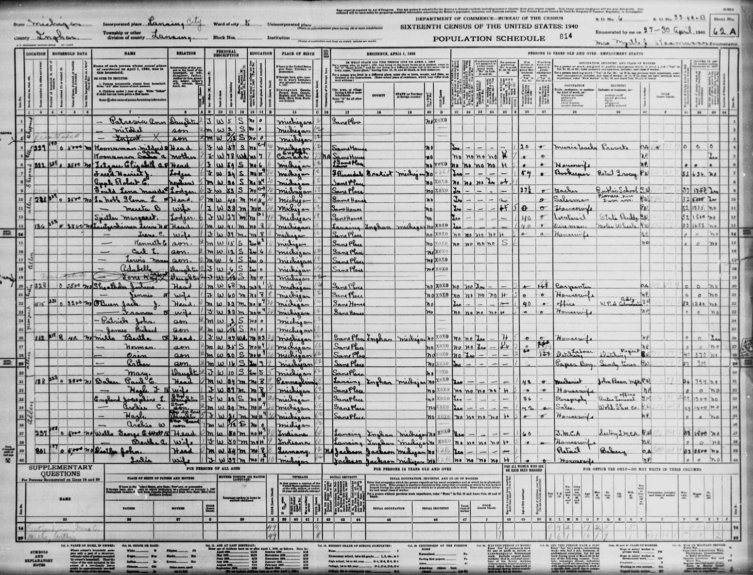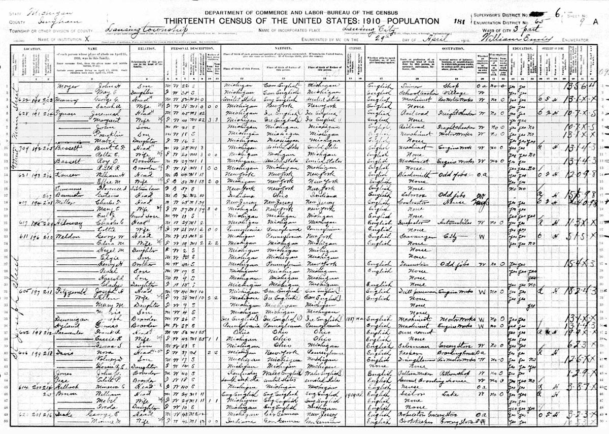 1900 Census, Oakley, Shiawassee, MI1910 Census, Oakley, Shiawassee, MI1920 Census, Lansing, Ingham, MI1930 Census, Lansing, Ingham, MI1940 Census, Lansing, Ingham, MI1950 Census, Lansing, Ingham, MIBirth Record, State of MichiganWWI Draft Registration CardWWII Draft Registration CardMarriage Record, State of MichiganBurial headstone, Mt. Hope Cemetary, Lansing, MIBurial monument, Mt. Hope Cemetary, Lansing, MIResided in 1917 at 628 W Main, Lansing, MI