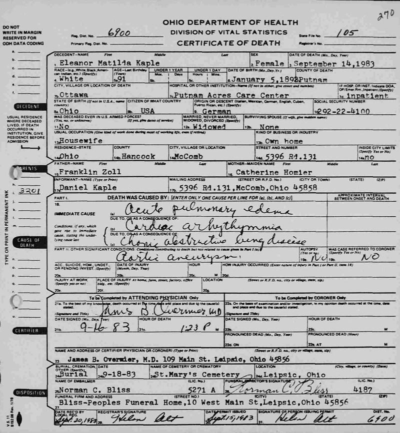 Dunn Edward James [Male] b. 16 OCT 1909 Ottawa, OH - d. 19 MAY 2006 Putnam Acres Care Center, Ottawa, OH