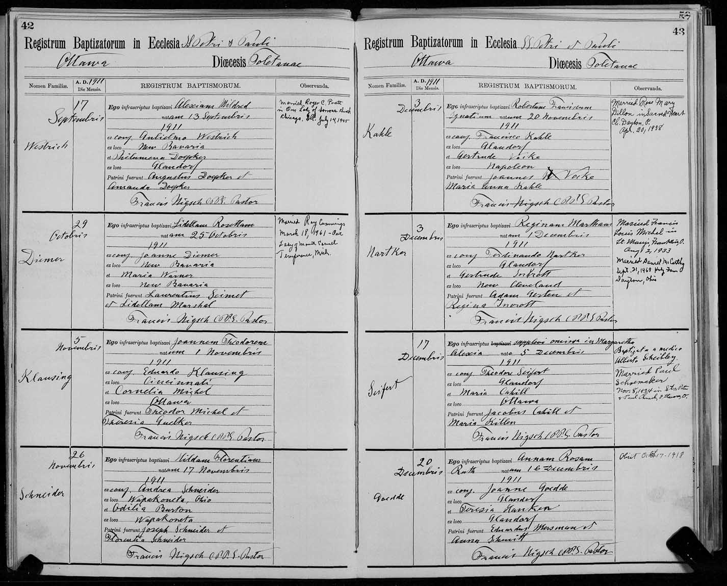Baptismal Record, Sts Peter and Paul Catholic Church, Ottawa, OH