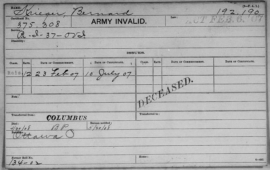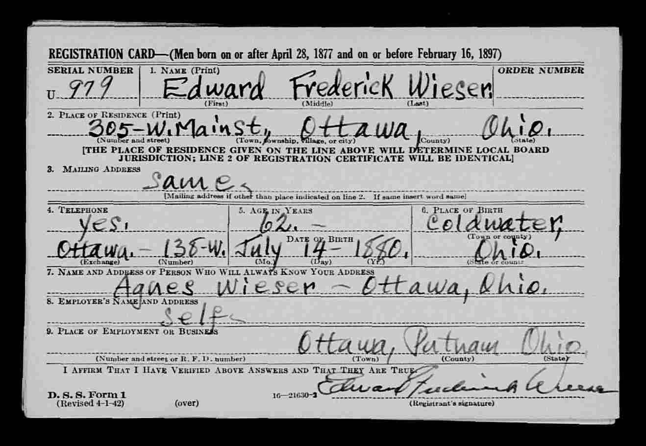 1900 Census, Leipsic, Putnam, OH1940 Census, Pleasant Twp, Henry, OHDrafrt Registration Card, World War IMarriage record, State of OhioResided in 1918 in Kalida, Putnam, OH.
