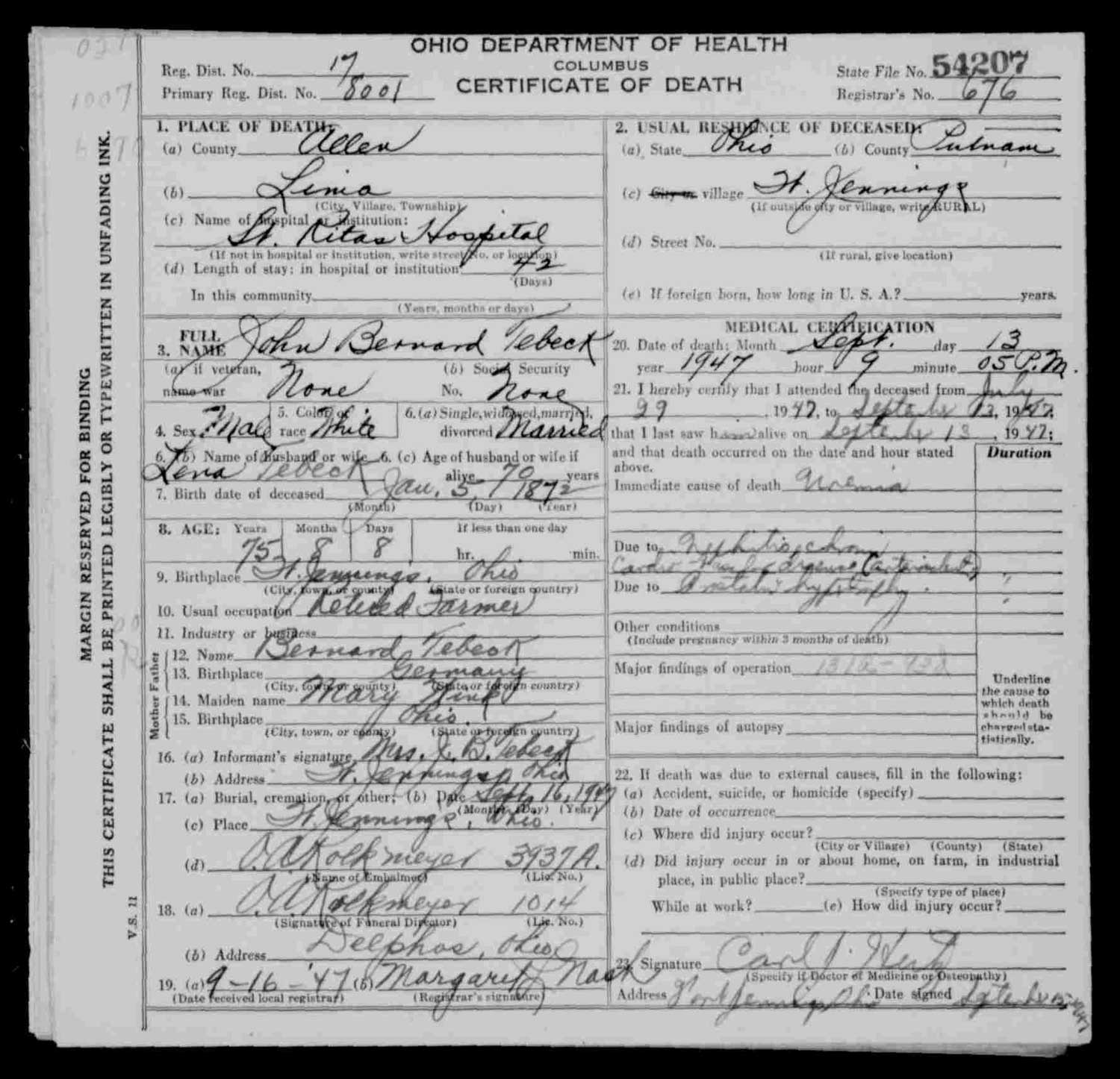 1920 US Census, Greenburg Twp, Putnam, OH1940 Census, Greenburg Twp., Putnam, OH1940 Census, Richland Twp., Defiance, OHDeath record, St John the Evangelist Catholic Church, Defiance, OHBurial headstone, Riverview Memory Gardens, Defiance, OHObituary: