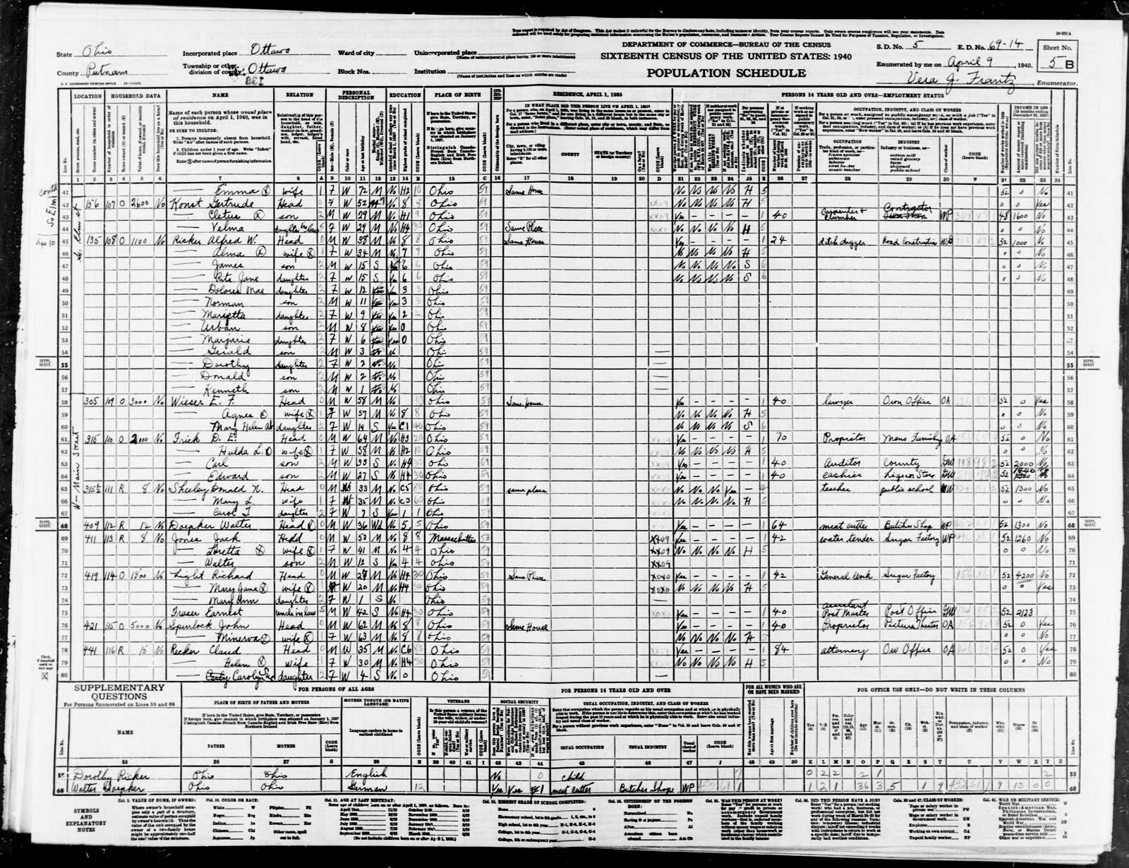 1940 Census, Ottawa, Putnam, OH