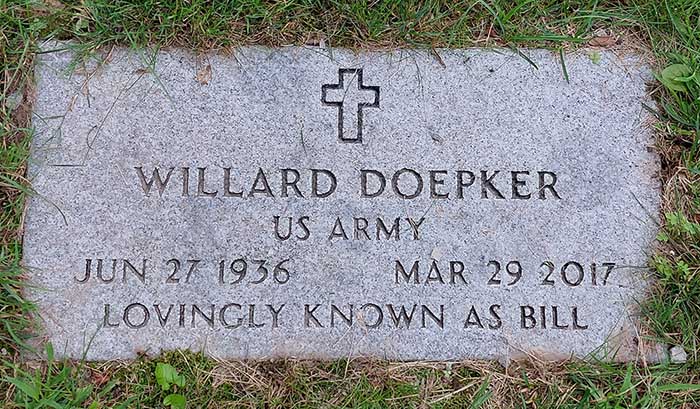 Surviving besides his wife Patricia are one son, Gerald and Carie Doepker; four step-daughters and one step-son, Lisa B. Langley, Michelle Babcock, Dawn Forsberg, Pam Spencer and Greg Berkobien; several grandchildren; one sister and two brothers, Joanne Schafer, Joe and Kathy Doepker, Robert and Kathleen Depker; many nieces and nephews. Willard was preceded in death by two brothers, Tom and Jim Doepker and a sister Maureen Quellette.